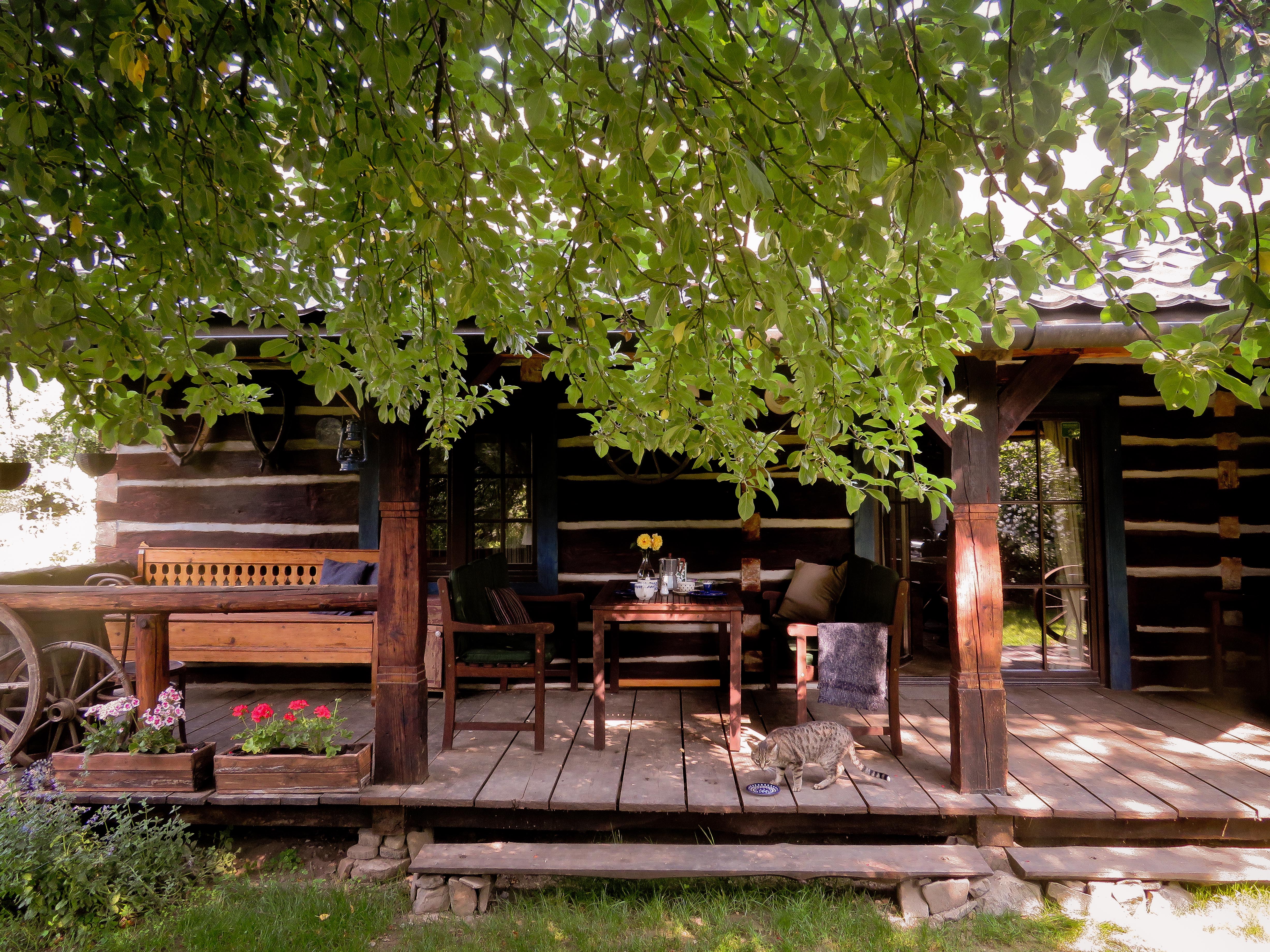 Nasz dom to już 10 lat naszej wspólnej historii wypełnionej chęcią zmian i realizacji marzeń o spokojnym życiu wśród przyrody i życzliwych sąsiadów. Razem postanowiliśmy stworzyć dla siebie i naszych gości przestrzeń w której będzie można odpocząć i zapomnieć o miejskich troskach. Zrelaksować się wśród śpiewu ptaków, szumu drzew, w cieniu naszego domu oraz porozmyślać podczas długich spacerów po lesie i górach. Droga do osiągnięcia wymarzonego celu nie była drogą lekką i łatwą. Projektowanie, remontowanie, budowanie, praca w drewnie, tworzenie ogrodu... te i wiele innych umiejętności dla dwójki ludzi po studiach humanistycznych okazały się niezbędne by móc stworzyć nasze miejsce na ziemi, którym chcemy się z Wami dzielić. Na co dzień poza dbaniem o naszych gości i doglądaniem gospodarstwa staramy się realizować swoje pasje artystyczne (muzyczne, plastyczne, fotograficzne itp.) ale nie tylko. Znajdujemy też czas na sport, chociażby dogtrekking. Nasze życie codzienne nie byłoby kompletne bez towarzystwa naszych futrzastych przyjaciół, trzech kotów, trzech psów i dwóch koni Wirusa i Promyka.